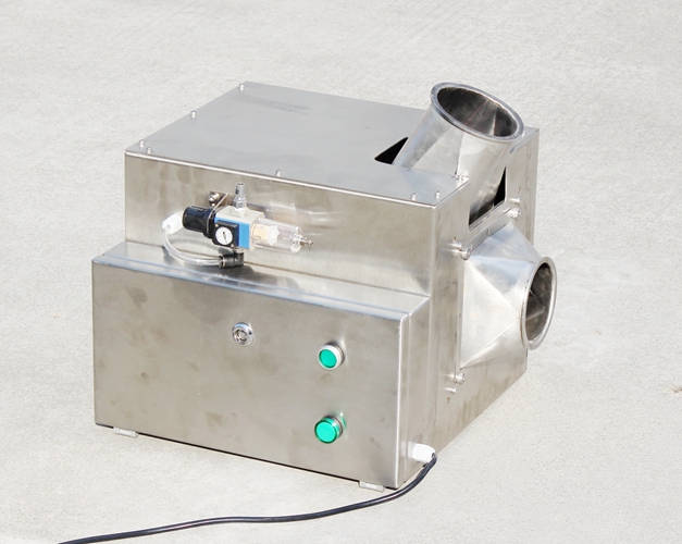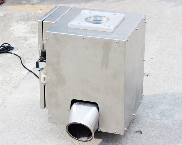 原料從料斗或送料器自由下落進入金屬分離器,如果沒有金屬雜質,原料會直接通過金屬分離器流向下端的出料口。如果檢測器檢測到原料中含有金屬,那么控制器立刻啟動分離板將金屬物和部分原料一起導向側面的排料口,然后分流板迅速恢復至正常的位置,分流板速度可調,金屬分離器的檢測精度也可根據生產需要調節(jié),最小可檢測并分離出Φ 0.2mm的金屬顆粒。